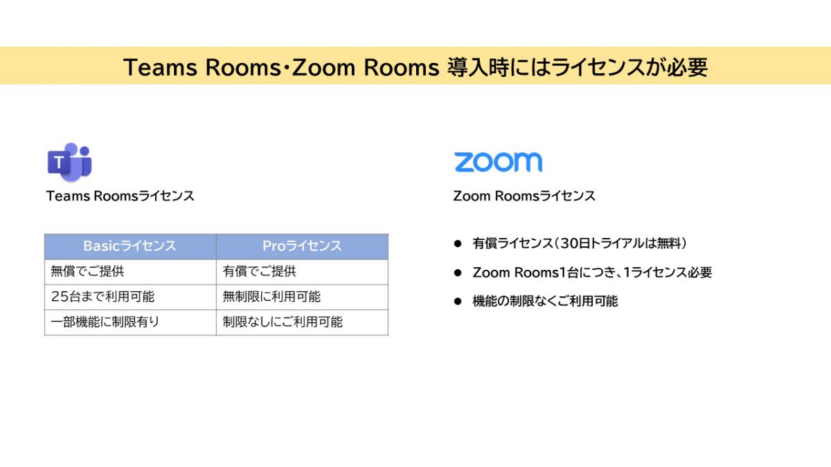 最後にTeams Rooms・Zoom Roomsを導入する前に検討すべき事としまして、それぞれ「ライセンス」が必要になります。Zoom Roomsの場合は1台のZoom Roomsにつき1つの有償ライセンスが必要なので分かりやすいですが、Teams Roomsの場合は2つのライセンスが用意されています。