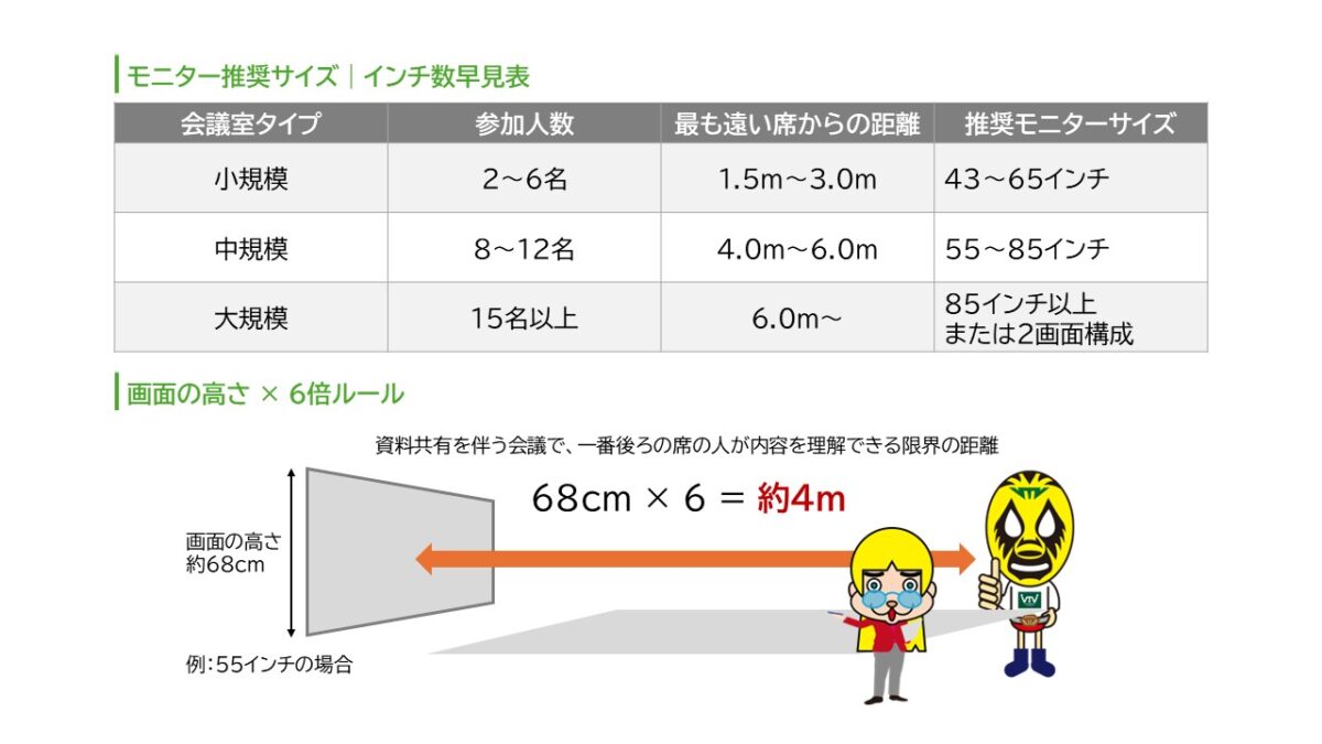 「画面の高さ × 6」の距離が、最も遠い席の限界距離とされてるんや。なので例えば55インチのモニターを考えると、55インチのモニター画面の高さは約68cmあるから、それに6を掛ける。 68cm × 6 =約4m という事で、モニターの設置場所から会議机の端までが4mの場合、55インチのモニターが推奨サイズになるワケや。